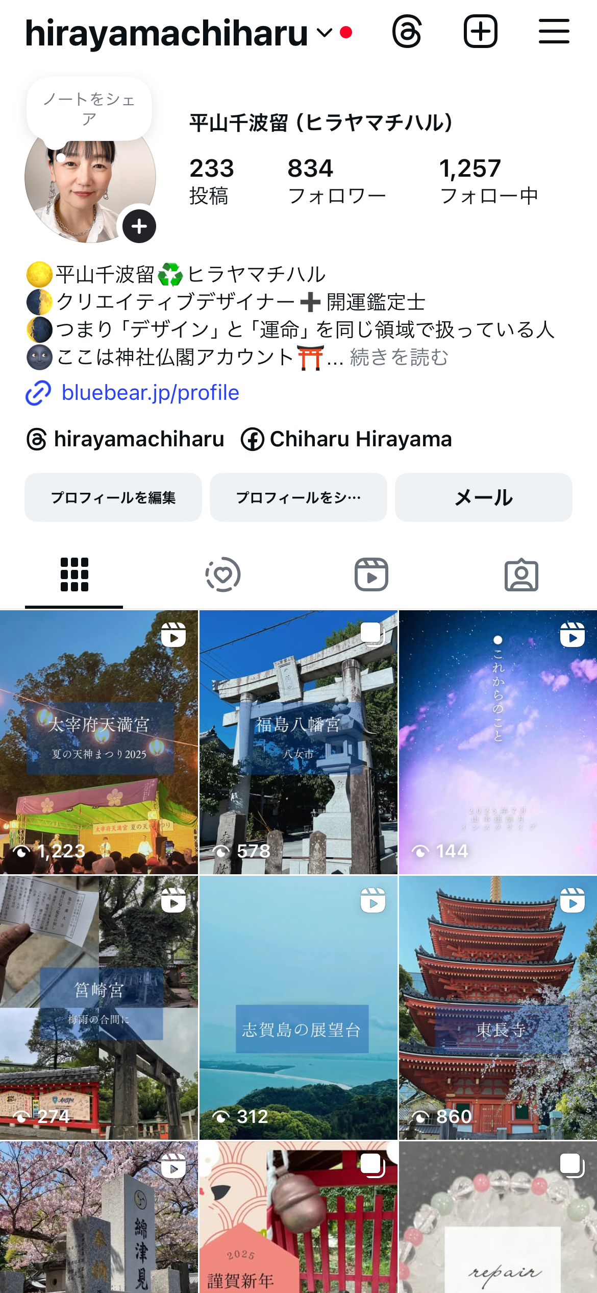 2015年から使っているプライベートアカウント。POSTは神社仏閣がメインになっていますが、ストーリーズはほぼ日常のくだならいつぶやき😁